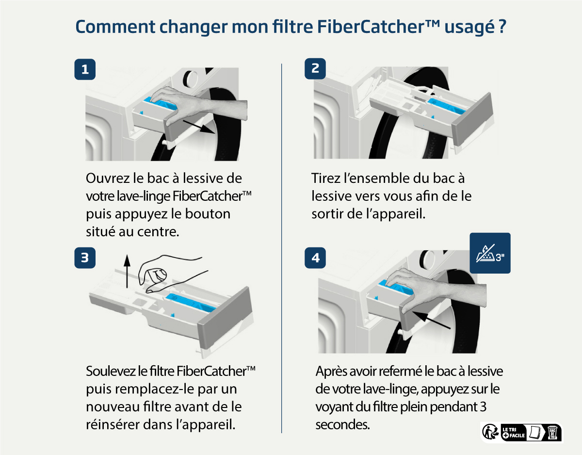 Pour retourner votre filtre usagé afin de le recycler, c'est facile ! En plus, nous prenons en charge les frais d'envoi. Ne le jetez pas aux ordures ! Cela réduirait à néant les efforts consentis par votre appareil pour capturer les microfibres plastiques.